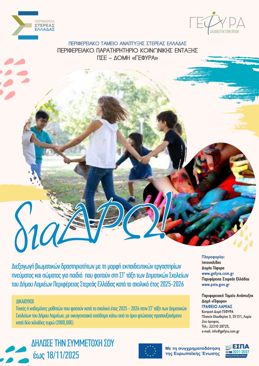 Το Περιφερειακό Παρατηρητήριο Κοινωνικής Ένταξης Περιφέρειας Στερεάς Ελλάδας - Δομή "ΓΕΦΥΡΑ" υλοποιεί για πρώτη φορά, τη δράση «διαΔΡΩ!» που αφορά την συμμετοχή σε βιωματικές δραστηριότητες με τη μορφή εκπαιδευτικών εργαστηρίων πνεύματος και σώματος, των μαθητών - μελών οικογένειας με οικογενειακό εισόδημα κάτω από τα όρια της φτώχειας, προσαυξανόμενο κατά δύο χιλιάδες ευρώ (2.000,00€), που φοιτούν στην ΣΤ’ τάξη των Δημοτικών Σχολείων του Δήμου Λαμιέων της Π.Ε Φθιώτιδας της Περιφέρειας Στερεάς Ελλάδας κατά το σχολικό έτος 2025-2026.